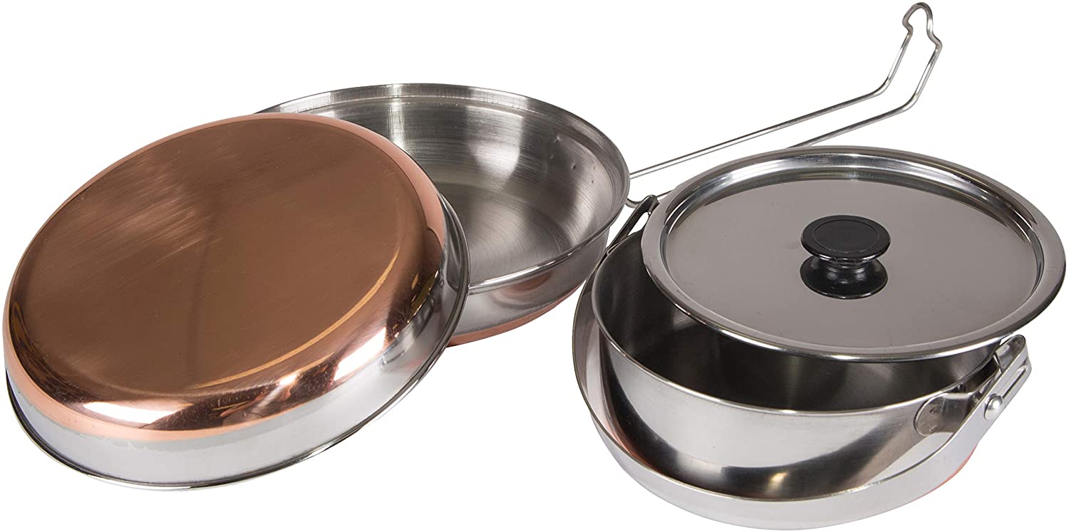Don't waste money on ultra-flimsy aluminum or plastic mess kits. This copper-bottomed steel set is not expensive, and it's all you need for food prep on a camping trip or emergency situation of any duration.